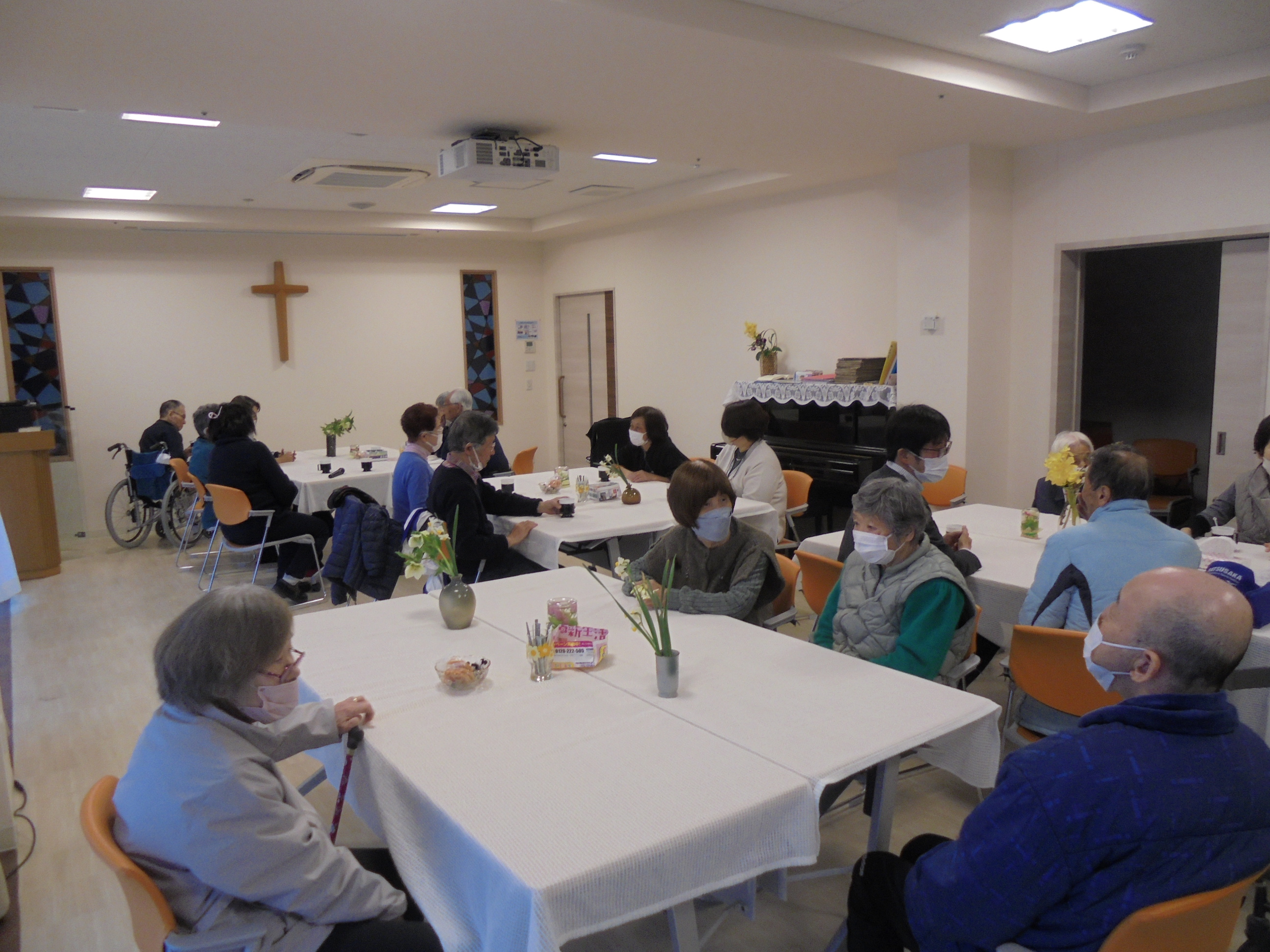 3月11日(火)14時よりグレイスホーム多目的ホールにてめぐみカフェを開催しました。 今月は、おいしいデザート(シュークリーム)を食べながら、席が近い方同士でお話をして過ごされました。 その後は、職員によるジェスチャーゲームと季節を感じさせる歌を歌いながら楽しみました。 次回は4月8日(火)を予定しております。