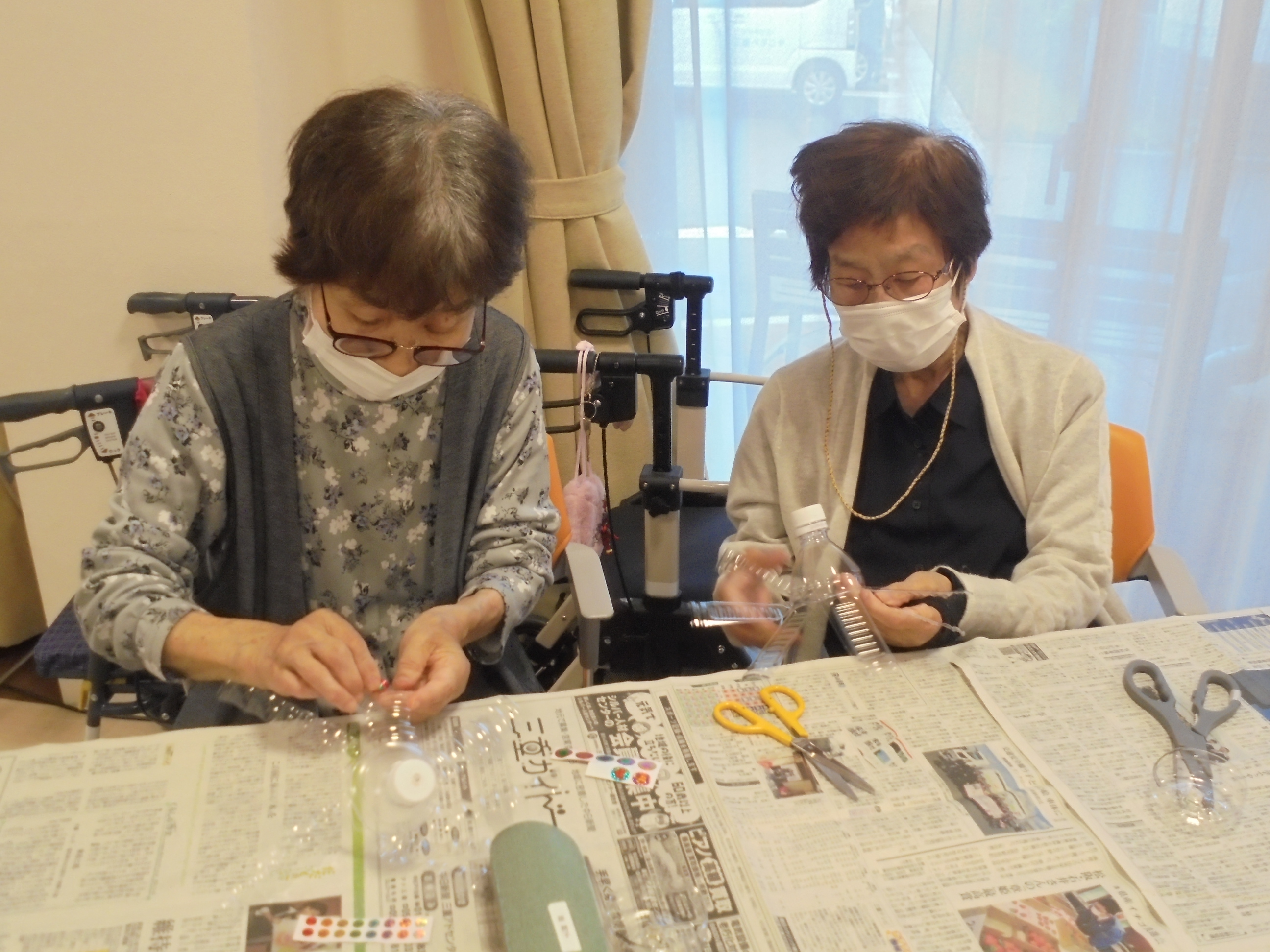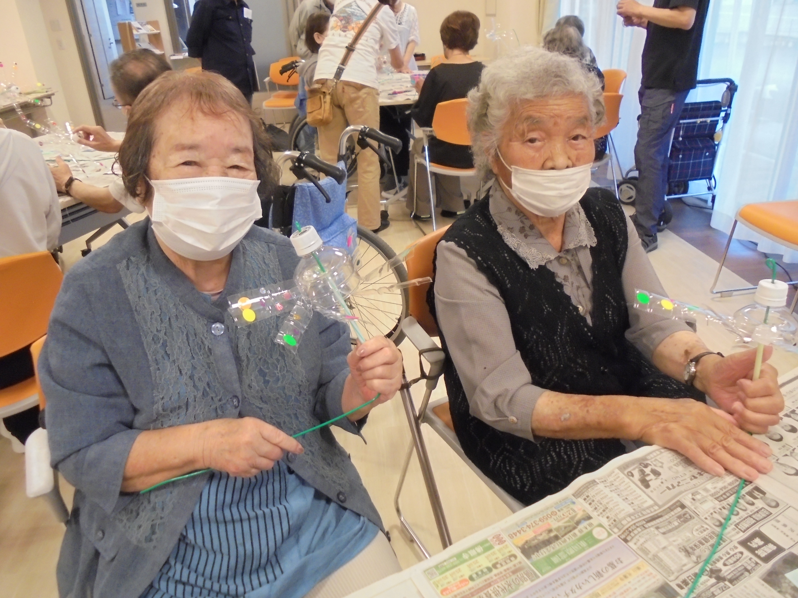 6月10日(火)14時よりグレイスホーム多目的ホールにてめぐみカフェを開催しました。 今月はペットボトルを使った風車を作りました。 皆様、苦戦されながらもシールを綺麗に張ったり様々な色のビーズを入れたりとオリジナルの風車を完成されました。 現在はお部屋や施設の敷地内に飾って楽しまれています。 次回は7月8日(火)を予定しております。