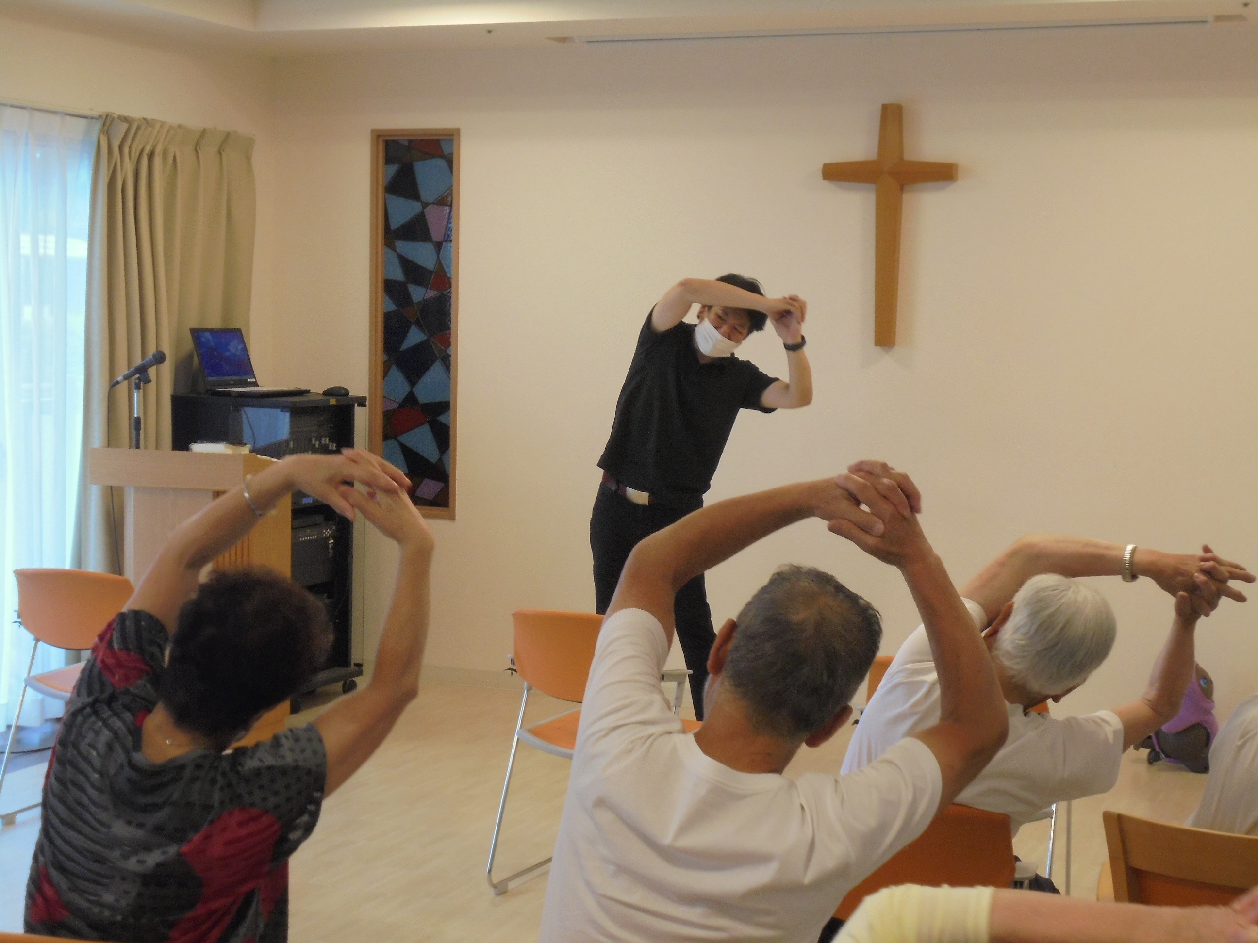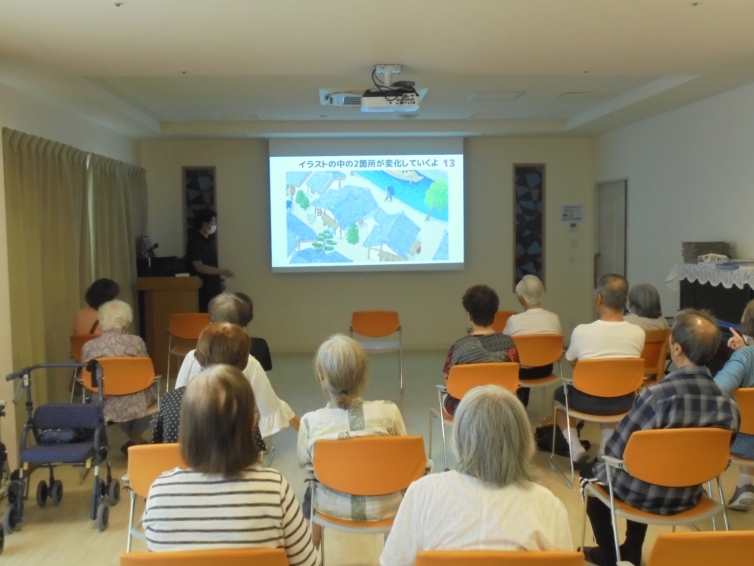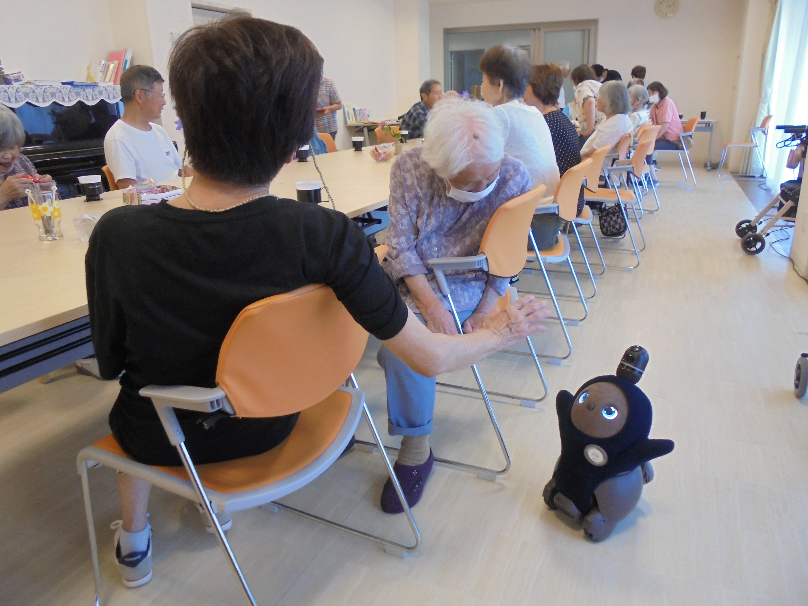 7月8日(火)14時よりグレイスホーム多目的ホールにてめぐみカフェを開催しました。 今月はイラストが変化していくクイズを使った頭の体操から始まり、座ったまま行えるリズム体操にて軽い運動を行いました。 その後はお話をしながらお茶の時間を楽しみました。 今回は特別にペットロボットのLOVOT(ラボット)が遊びに来てくれました。 皆様、たくさん話しかけてくださりラボットも大喜びでした。 次回は8月12日(火)を予定しております。