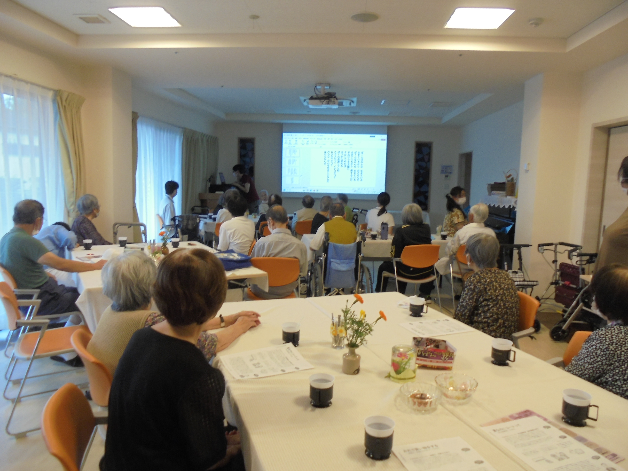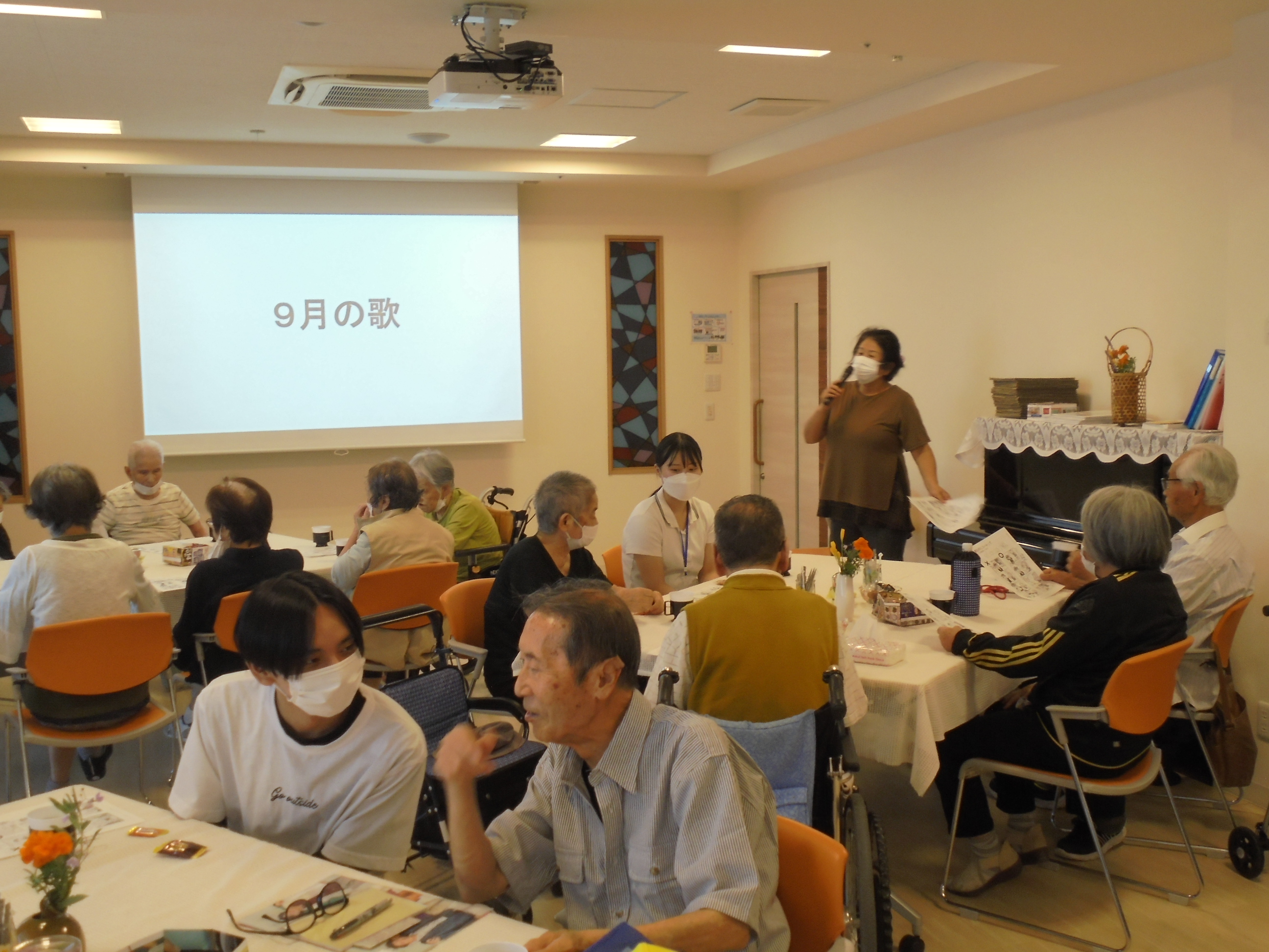 9月9日(火)14時よりグレイスホーム多目的ホールにてめぐみカフェを開催しました。 今月も介護等体験にて、教員を目指されている大学生の方が参加されました。 初めに認知症の家族と接する短編ドラマを鑑賞して感想を話し合いました。 その後は周りの方とお話を楽しみ、最後は季節を感じる歌や馴染みのある歌を歌いました。 次回は10月14日(火)を予定しております