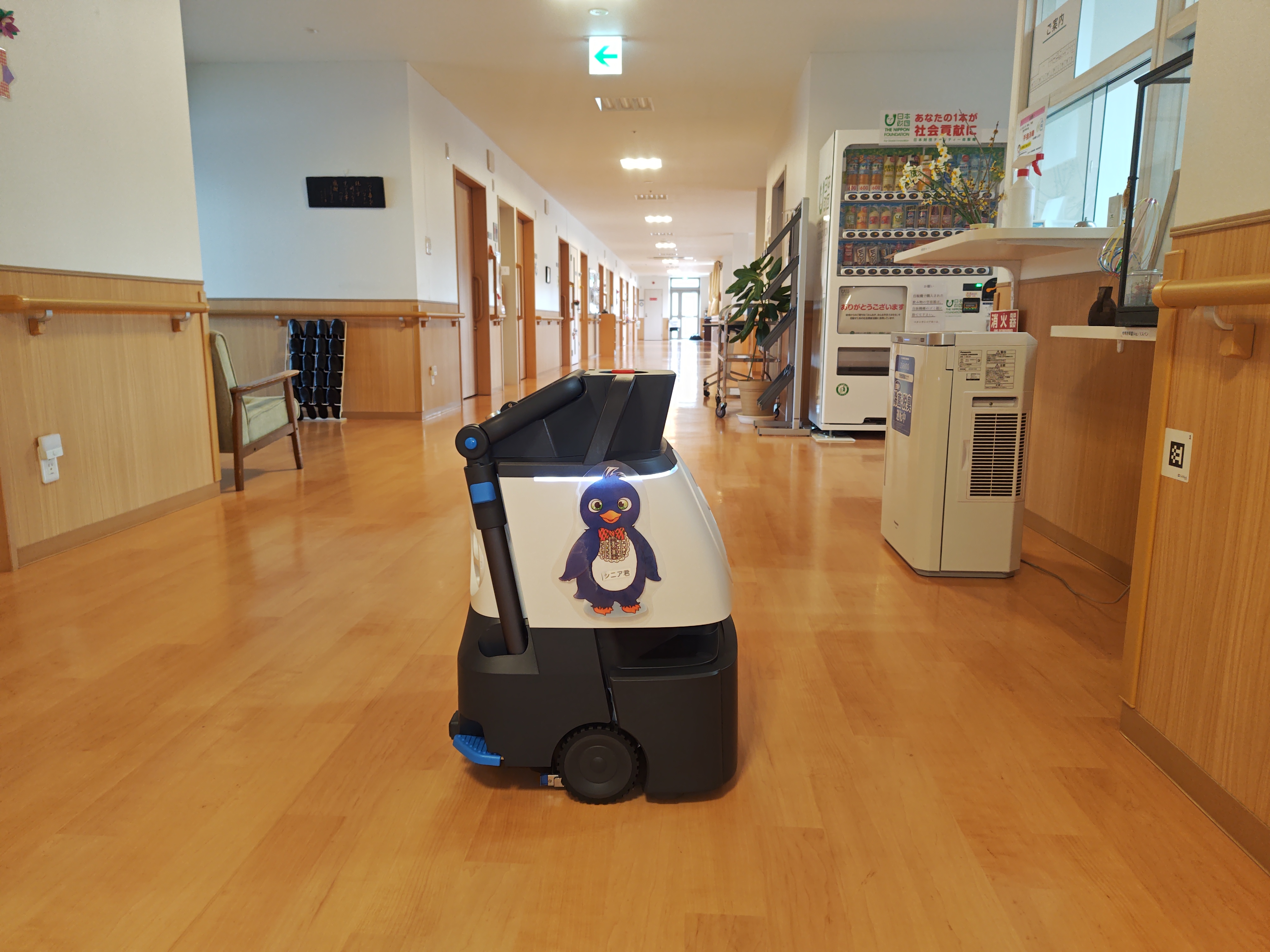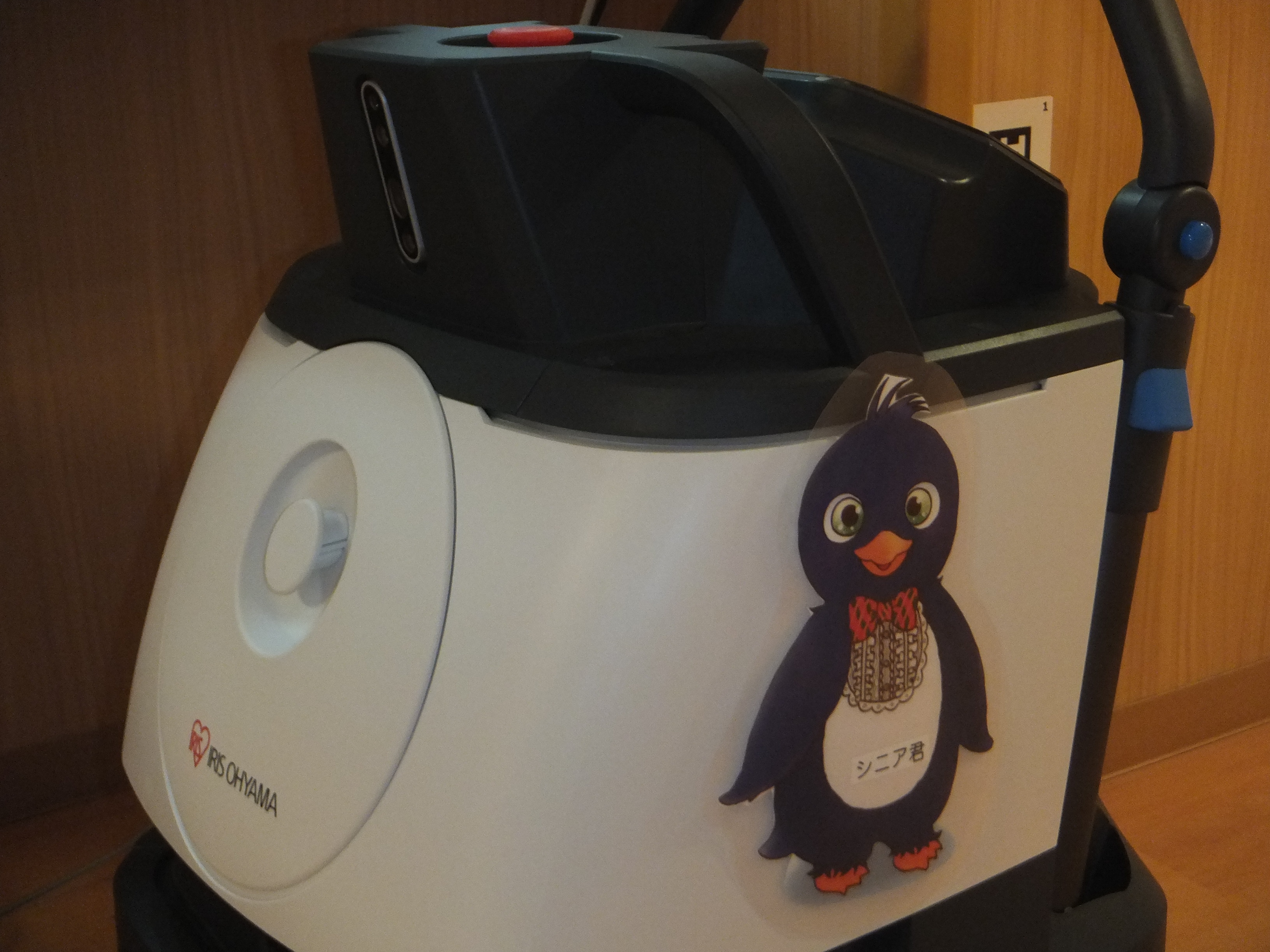 シニアホームの長い廊下を毎日、掃除機を掛けてくれる掃除ロボット「シニア君」 私たち職員と一緒に研修期間が終わるまで働いています。 入居者の方から名前を付けて頂きかわいらしいキャラクターで隅々まで走り回っています。