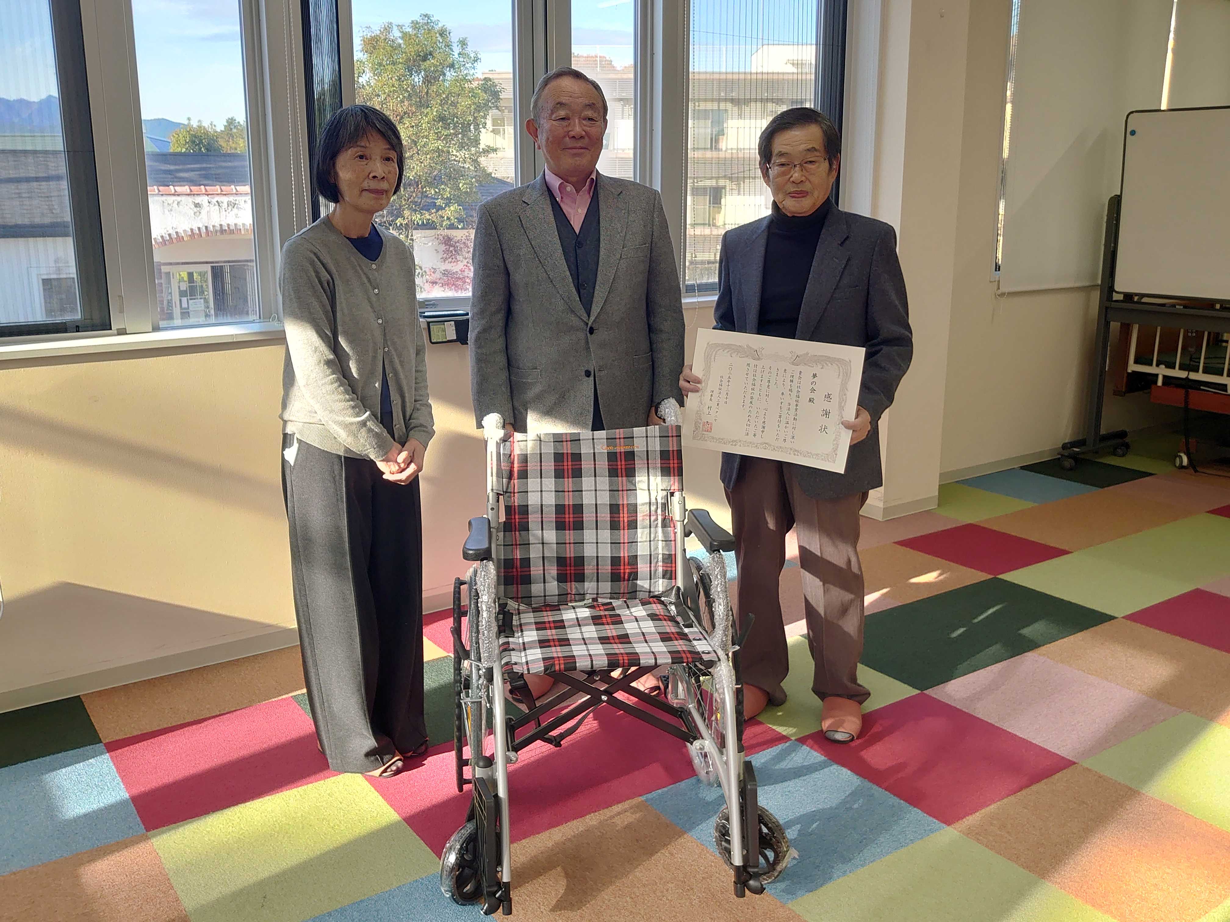 夢の会様より車いす2台をご寄贈いただきました。心より感謝申し上げます。 津市にある特別養護老人ホームと在宅介護複合施設で活用させていただきます。